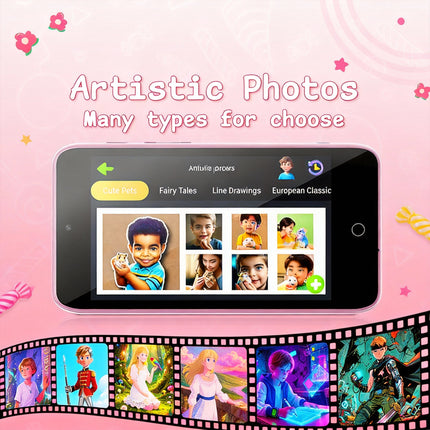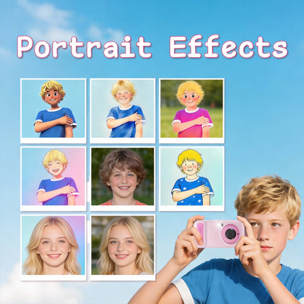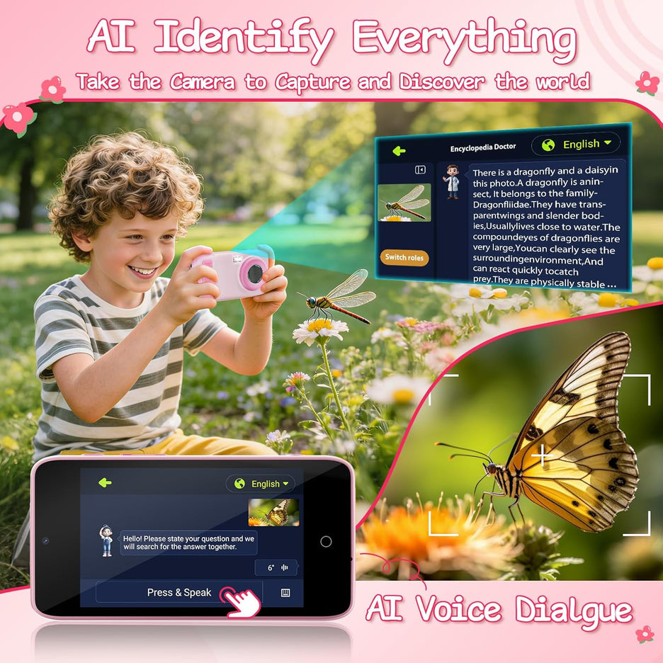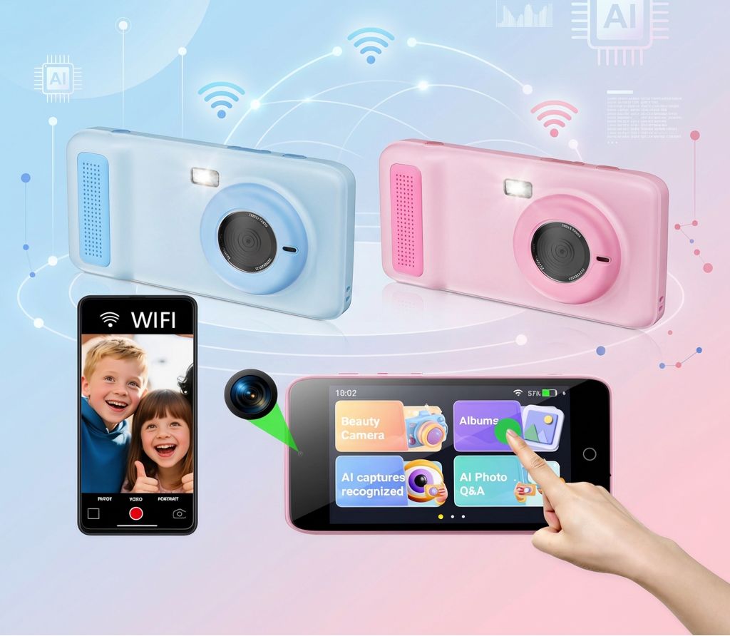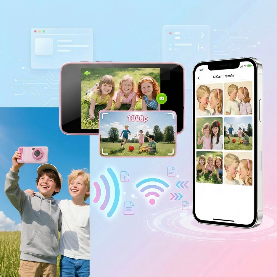 "Dual-lens design captures 48MP high-res photos and 1080p videos—perfect for both stunning landscapes and fun selfies. Connect to phones via the free "AI Cam Transfer" app for cable-free sharing, preserving kids’ wonderful moments."
